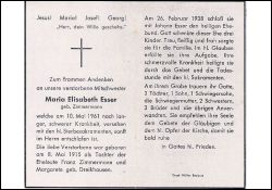 | Lange, schwere Krankheit; Eltern: Franz Zimmermann u. Margarete geb. Dreikhausen; ∞ 26.2.1938 Johann Esser; 3 K.; lange, schmerzvolle Krankheit; Druck in Bedburg/Erft |
