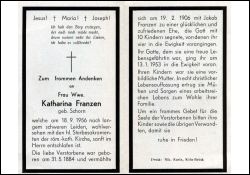 | Langes, schweres Leiden; ∞ 19.2.1906 Jakob Franzen, † 13.1.1953; 10 K., davon 4 †; Druck in Köln-Brück |
