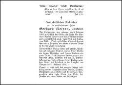 | Landwirt; Eltern: Reiner Reipen u. Anna Maria geb. Cremer; ∞ 2.6.1911 Katharina Töller; 2 Töchter, davon 1 †; längeres Leiden |