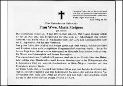 | ∞ 25.5.1912 August Steigers, am 10.9.1918 im 1. Weltkrieg gefallen; 4 K., davon 1 früh †; mitsorgend im Haushalt ihres ältesten Sohnes tätig; Herzinfarkt |