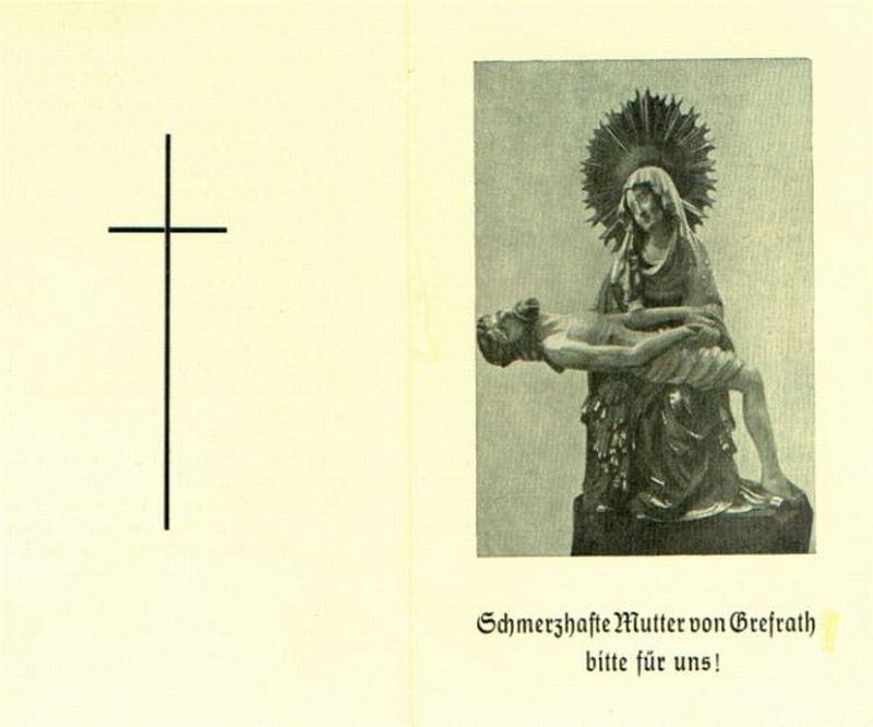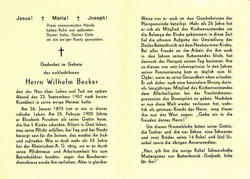 ∞ 25.02.1900 mit Elisabeth Porschen, 5 Kinder. Mehr als 55 Jahre bei der Rheinischen AG. Betriebsführer, Bundesverdienstkreuz, 25 Jahre Mitgl. des Kirchenvorstandes, um Himmelslohn bitten Gattin, Tochter † 4 Söhne, |