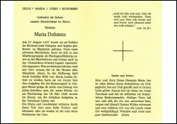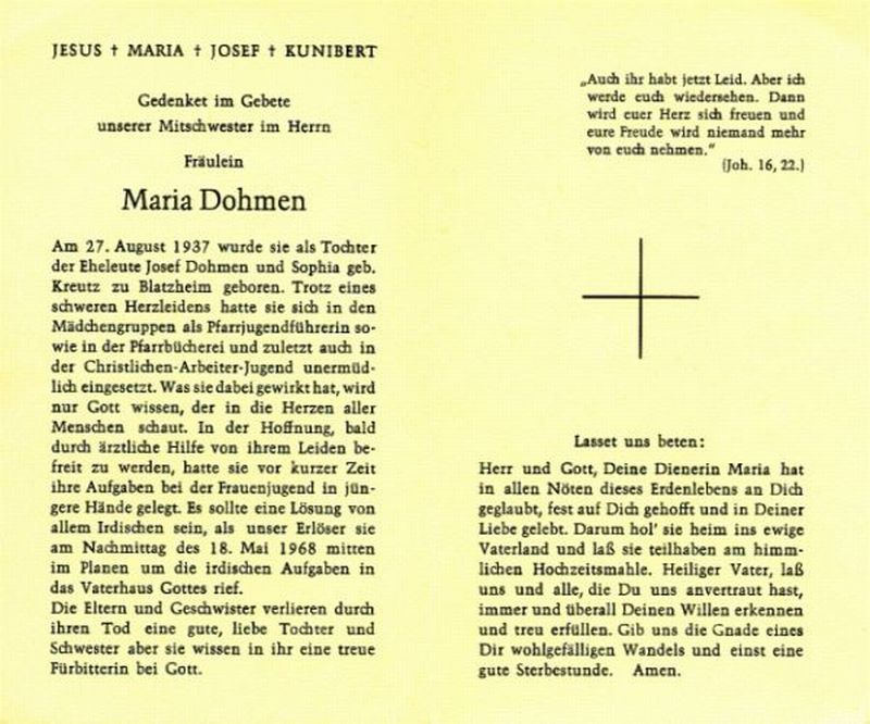 Eltern Josef Dohmen und Sophia geb. Kreutz; schweres Herzleiden; Pfarrjugendführerin; |