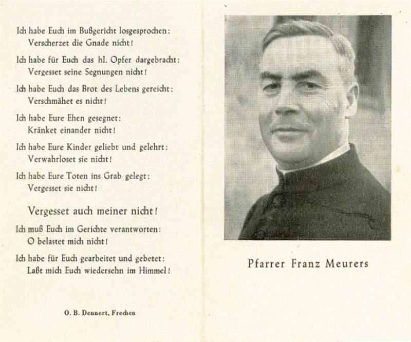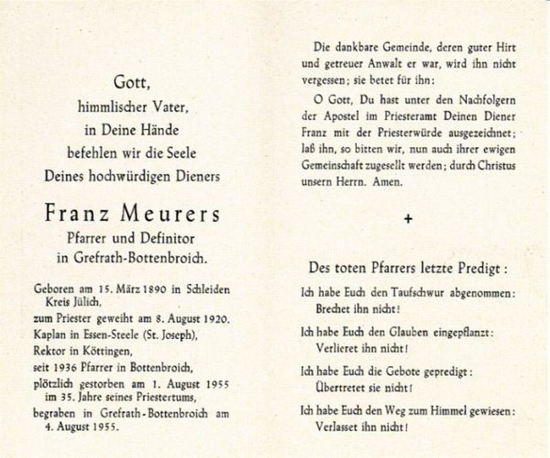 Pfarrer und Definitor seit 1936 in Grefrath-Bottenbroich; Priesterweihe 08.08.1920; im 35. Jahre seines Priestertums; |