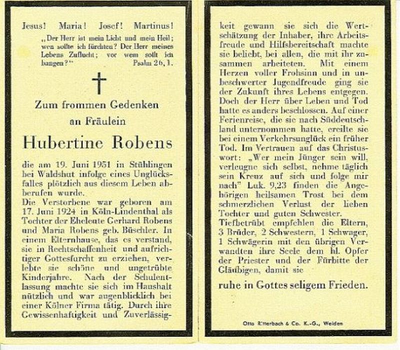 Fräulein; Eltern Gerhard Robens u. Maria geb. Büschler; † infolge eines Unglücksfalles im Urlaub; 3 Brüder, 2 Schwestern; |