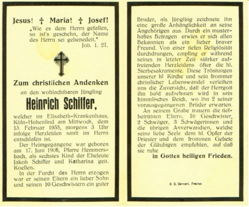 wohlachtbarer Jüngling; Eltern Jakob Schiffer und Katharina geb. Koellen; 10 Geschwister davon 2 †; Herzleiden; |