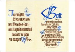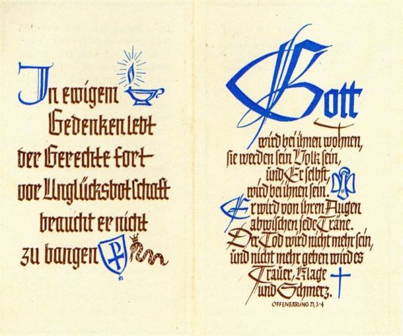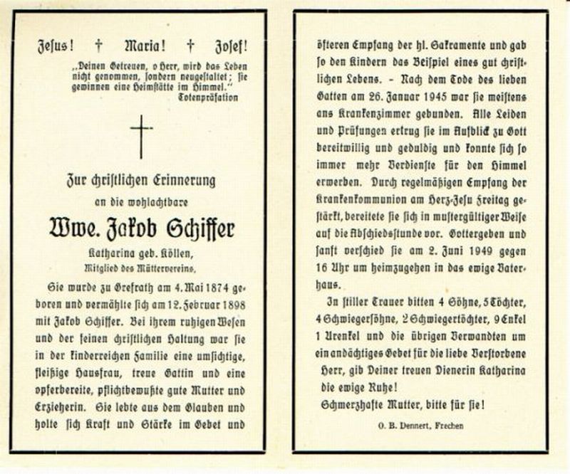 ∞ 12.02.1898 Jakob Schiffer 26.01.1945 †; Mitglied des Müttervereins; in Trauer 4 Söhne u. 5 Töchter; Druck: O.B.Dennert, Frechen; |