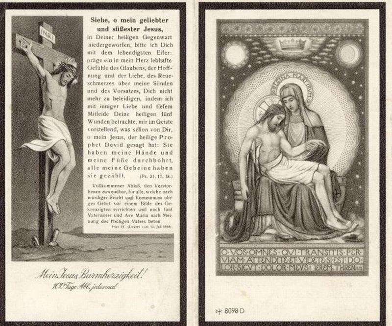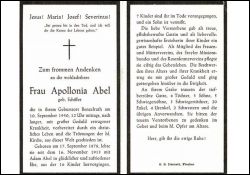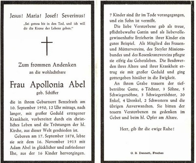 ∞ 16.11.1913 Adam Abel; 16 Kinder davon 7 †, 1 Sohn vermisst; Mitglied des Frauen- u. Müttervereins sowie Steyler Missionsbundes und Rosenkranzverein; |
