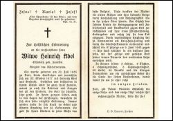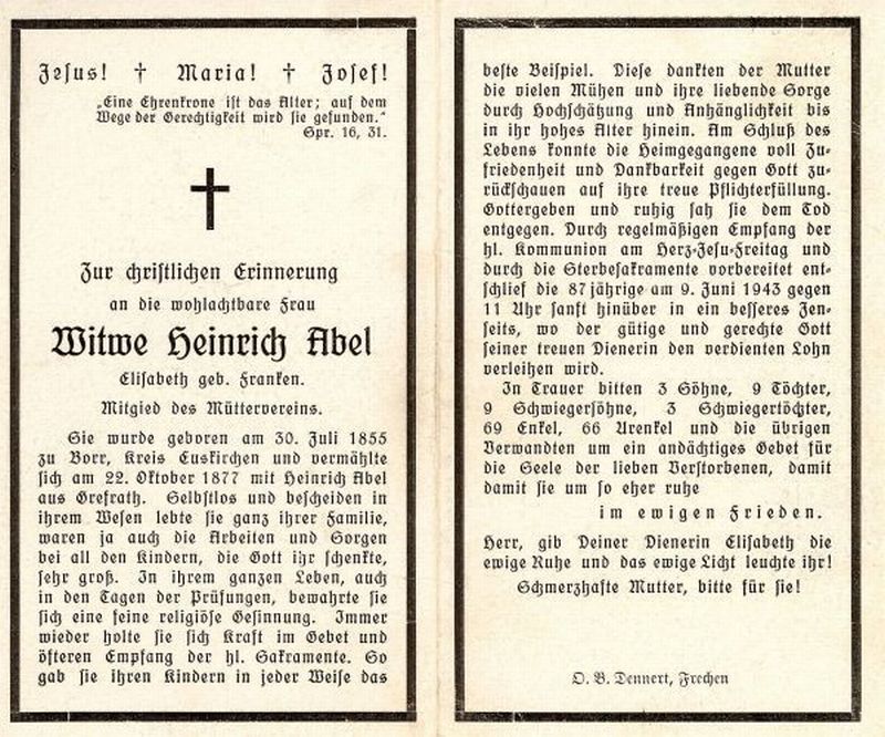 ∞ 22.10.1877 Heinrich Abel, Grefrath; in Trauer 3 Söhne und 9 Töchter, |