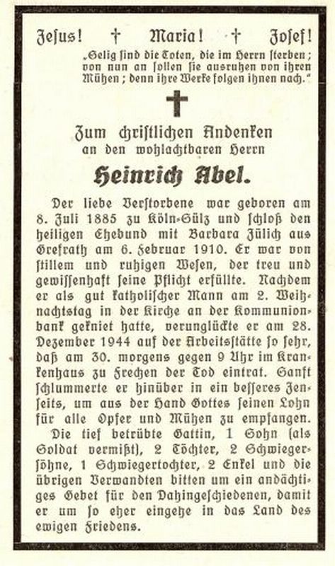 ∞ 06.02.1910 Barbara Jülich aus Grefrath; verunglückte an der Arbeitsstätte; 1 Sohn vermißt; 2 Töchter |