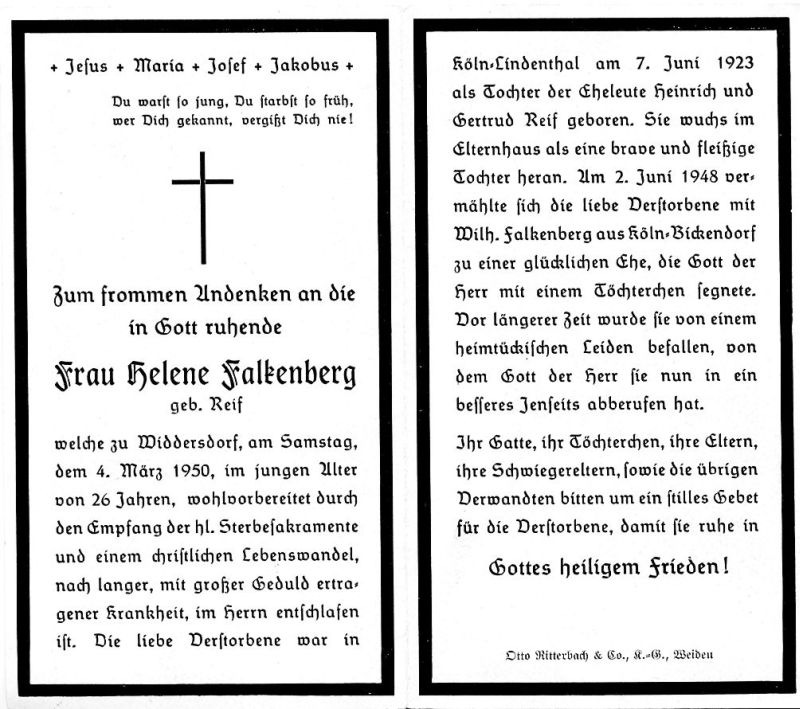 | 26 J.; lange Krankheit; Eltern: Heinrich und Gertrud Reif; ∞ 2.6.1948 Wilhelm Falkenberg aus Köln-Bickendorf; 1 Tochter |