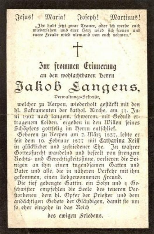 Verwaltungs-Sekretär; ∞ 10.02.1877 Catharina Reiff; 1 Sohn; |