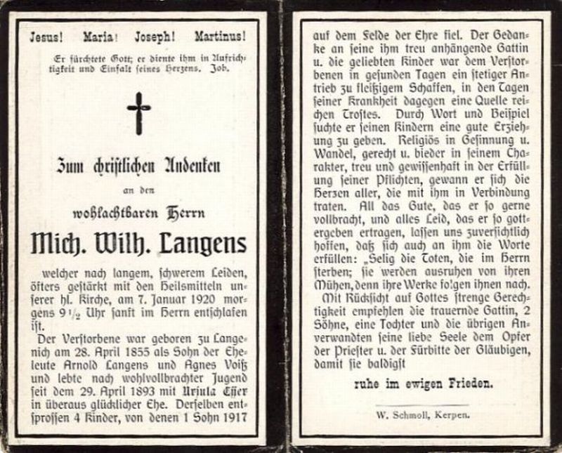 Eltern Arnold Langens und Agnes Voiß; ∞ 29.04.1893 Ursula Esser; 4 Kinder, davon 1 Sohn 1917 †; |
