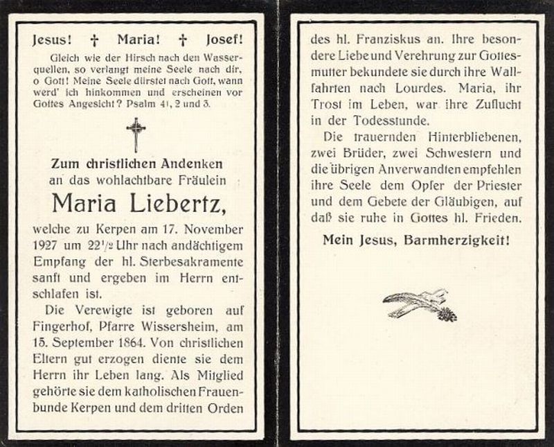 wohlachtbare Fräulein; Mitglied kath. Frauenbund Kerpen und dritten Orden des hl. Franziskus; 2 Brüder; |