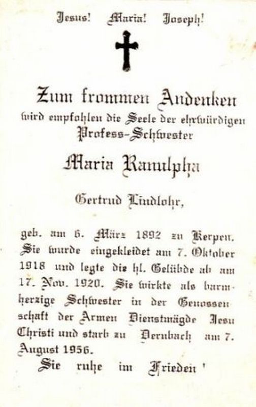 Profess-Schwester Maria Ranlpha, Schwester der Genossenschaft der Armen Dienstmägde Jesu Christi; |