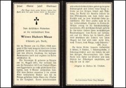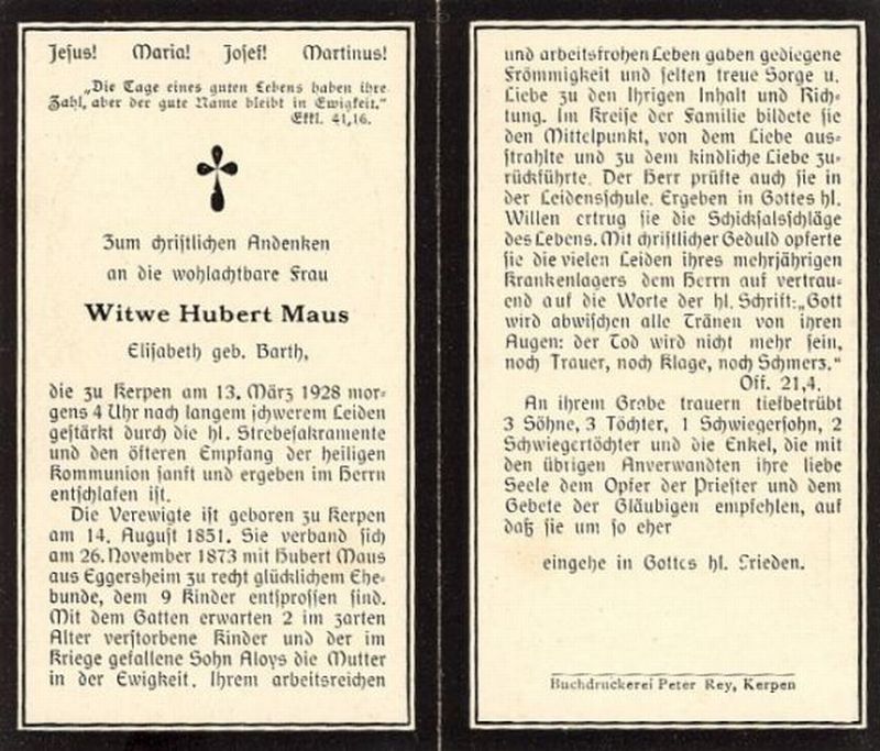∞ 26.11.1873 Hubert Maus aus Eggersheim; 9 Kinder, 2 vorher †; mehrjähriges Krankenlager; |