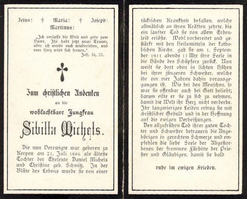 wohlachtbare Jungfrau; älteste Tochter der Eheleute Daniel Michels und Christine geb. Schmitz; tückische Krankheit; |