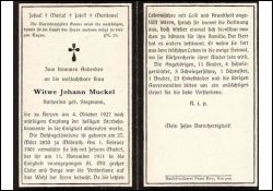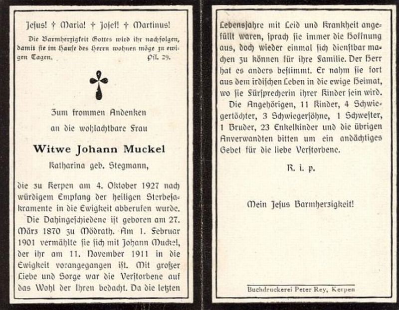 ∞ 01.02.1901 Johann Muckel, 11.11.1911.† ; 11 Kinder; |