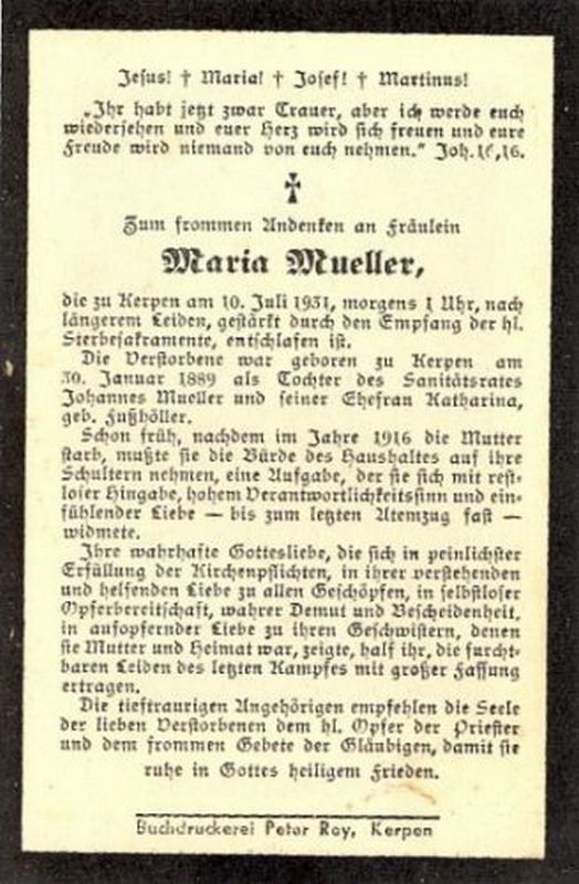 Fräulein; Eltern Sanitätsrat Johannes Mueller und Katharina geb. Fußböller † 1916 †; |