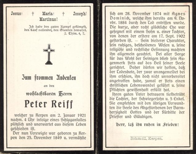 ∞ 28.11.1874 Agnes Dominick, 09.11.1884 †; 1 Sohn 17.09.1902 † und 1 Tochter; |