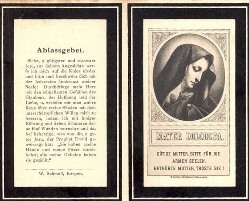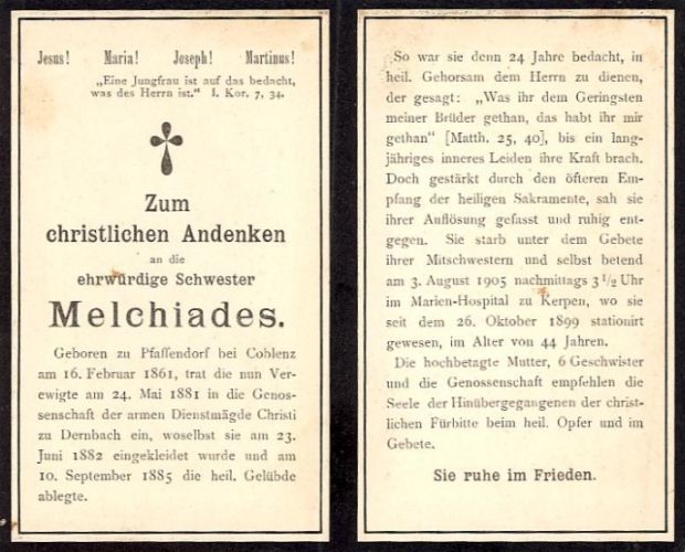 am 24.05.1881 in die Genossenschaft der armen Dienstmägde Christi zu Dernbach; 23.06.1882 Einkleidung und 10.09.1885 heil. Gelübde; |