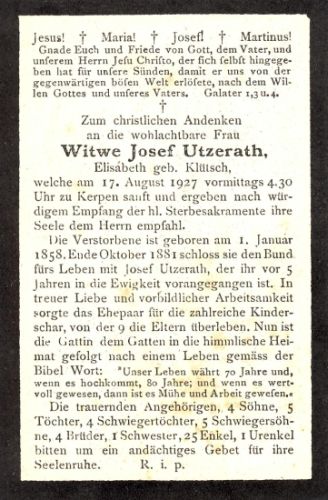∞ 10.1881 Josef Utzerath †; zahlreiche Kinderschar, von der 9 die Eltern überleben; |