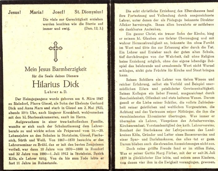 Eltern Gerhard Dich und Anna Marx; Lehrer a.D.; ∞ 26.07.1879 Marg. Färber; 9 Kinder; |