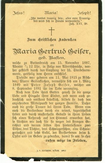 ∞ 01.03.1840 Peter Joseph Geiser, 08.09.1881 †; 2 Söhne, 3 Töchter; |