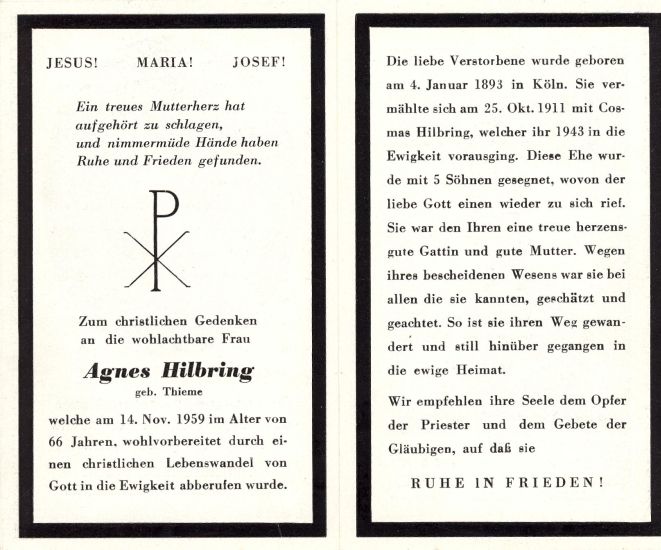 ∞ 25.10.1911 Cosmas Hilbring, 1943 †; 5 Söhne, davon 1 †; |