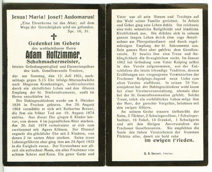 Schumachermeister; I. ∞ 20.08.1864 Katharina Breuer, 19.08.1874 †; 6 K., davon 4 †; II. ∞ 20.07.1878 Agnes Köhnen, 25.04.1925 †; 3 K., davon 2 †; letztes Gründungsmitglied des kath. Gesellenverein Frechen; |