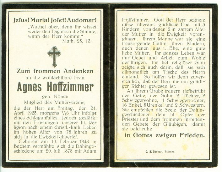 ∞ 20.07.1878 Adam Hoffzimmer; 3 K., davon 2 † ; Mitglied des Müttervereins; |