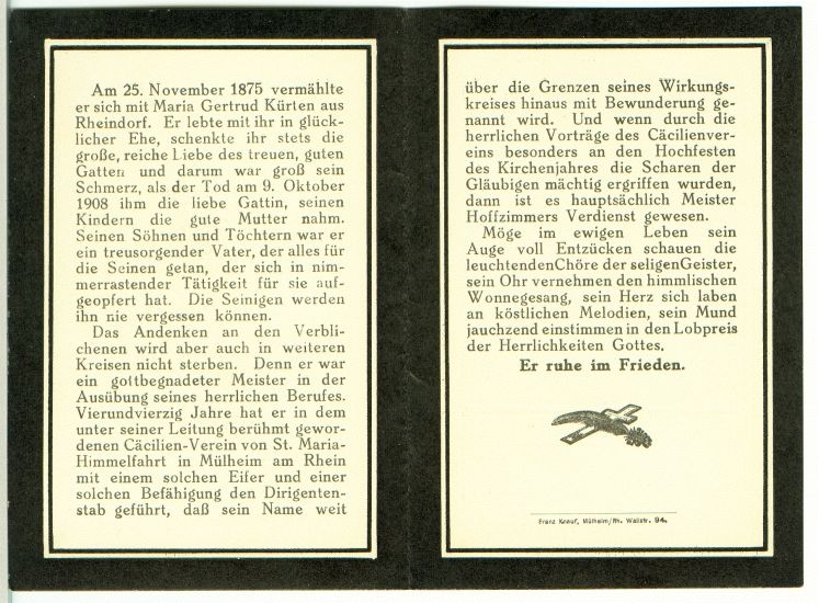 Organist und Chorleiter; ∞ 25.11.1875 Maria Gertrud Kürten aus Rheindorf, 09.10.1908 † ; |