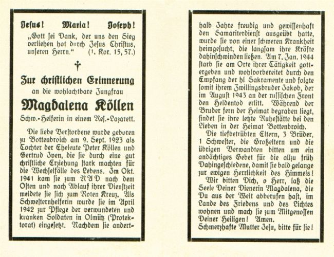 Eltern Peter Köllen und Gertrud Iven; Schw.-Helferin in einem Res.-Lazarett; |