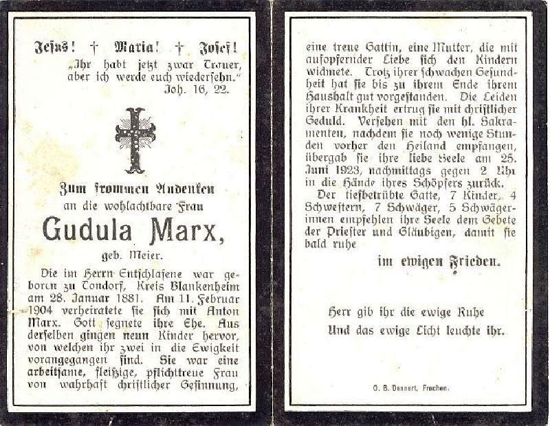 ∞ 11.02.1904 Anton Marx; 9 Kinder, davon 2 †; |