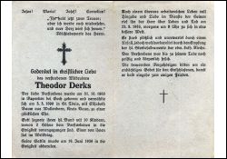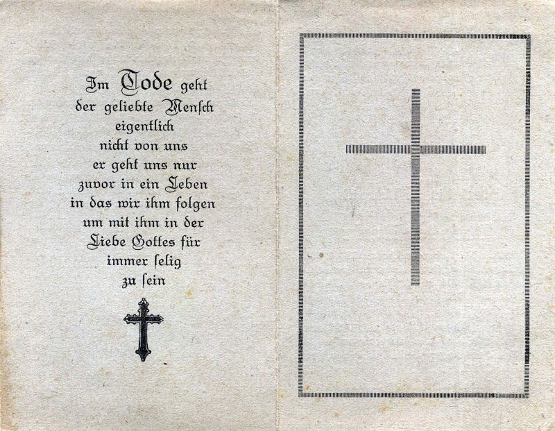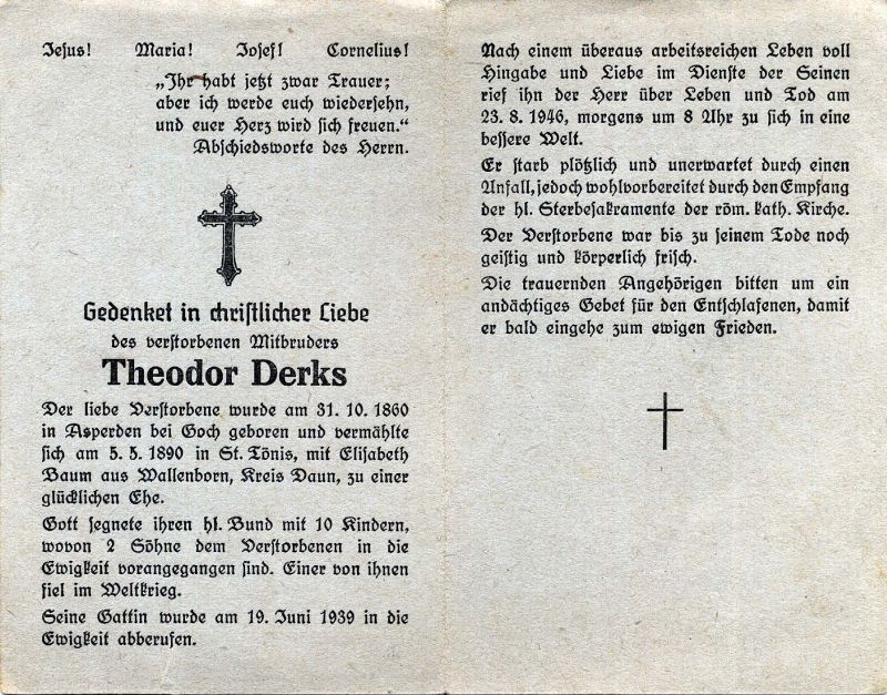 ∞ 5.5.1890 in St. Tönis Elisabeth Baum aus Wallenboren, Kr. Daun, † 19.6.1939; 10 K., davon 2 †, davon 1 im Weltkrieg gefallen |