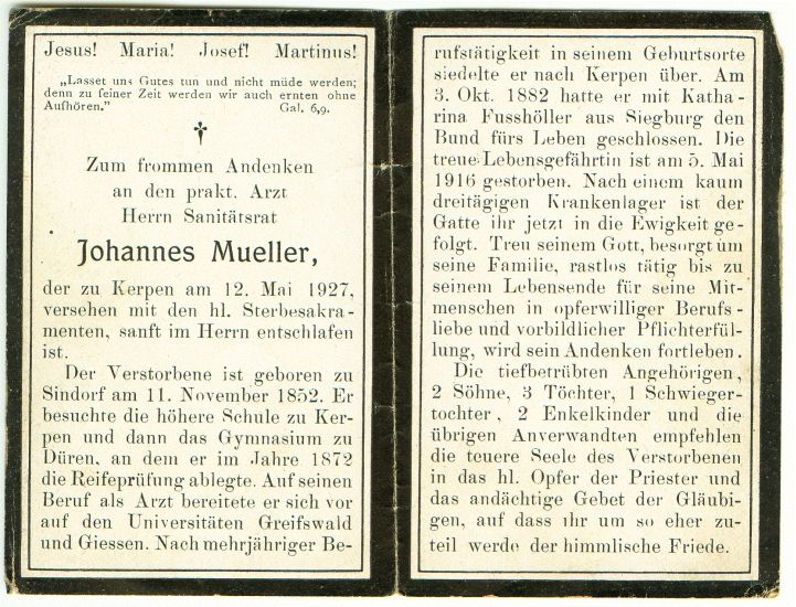 ∞ 03.10.1882 Katharina Fusshöller aus Siegburg, † 05.05.1916; 2 Söhne, 3 Töchter; prakt. Arzt, Sanitätsrat; |