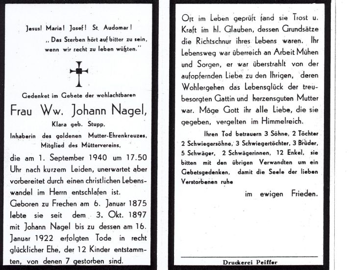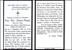 ∞ 03.10.1897 Johann Nagel, † 16.01.1922; 12 Kinder; Inhaberin des goldenen Mutter-Ehrenkreuzes, Mitglied des Müttervereins; |