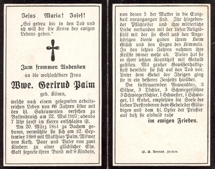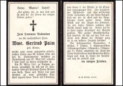 ∞ 22.09.1886 Matthias Palm, Witwer von Kath. Paar und Vater von 2 Kindern; Bund wurde mit 9 Kindern gesegnet; |