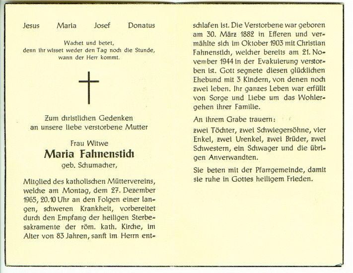 ∞ Oktober 1903 Christian Fahnenstich, in der Evakuierung 21.11.1944 †; 3 Kinder, davon 1 †; |