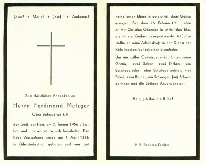∞ 26.02.1911 Christine Oberzier; 4 Kinder; Ober-Bahnwärter i.R.; 43 Jahre im Dienst der Köln-Frechen-Benzelrather-Eisenbahn; |