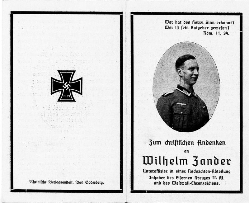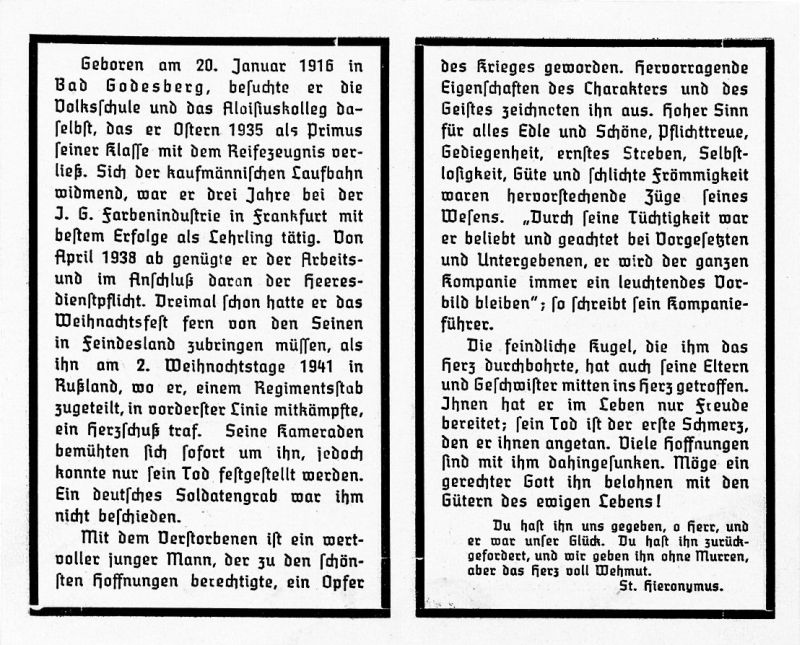 Gefallener 2. Weltkrieg; Herzschuß; Abitur 1935 Aloisiuskollog Bad Godesberg; Lehrling bei IG Farbenindustrie in Frankfurt |