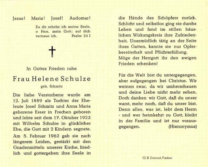 Eltern Josef Schmitz und Anna Maria Essen; ∞ 17.10.1923 Wilhelm Schulze; 2 Kinder; |
