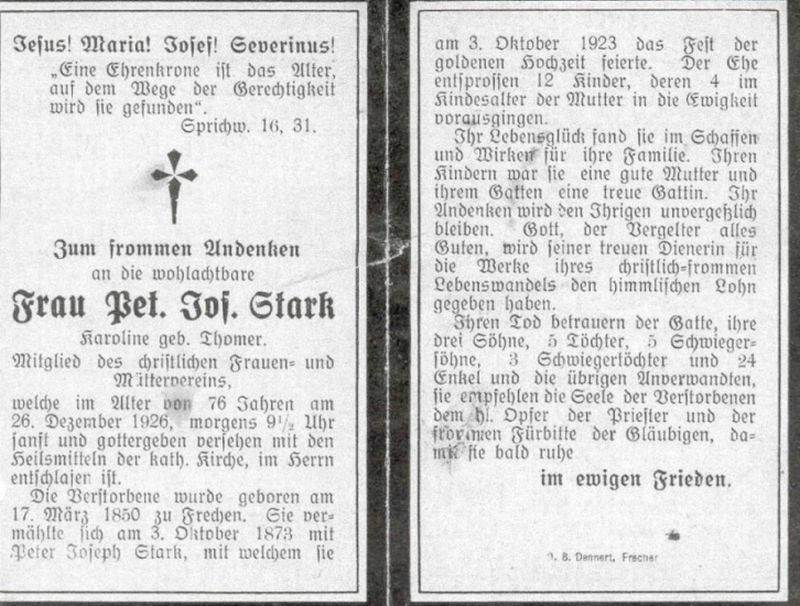 ∞ 03.10.1873 Peter Josef Stark; 12 Kinder, davon 4 † ; Mitglied des christlichen Frauen- und Müttervereins; |
