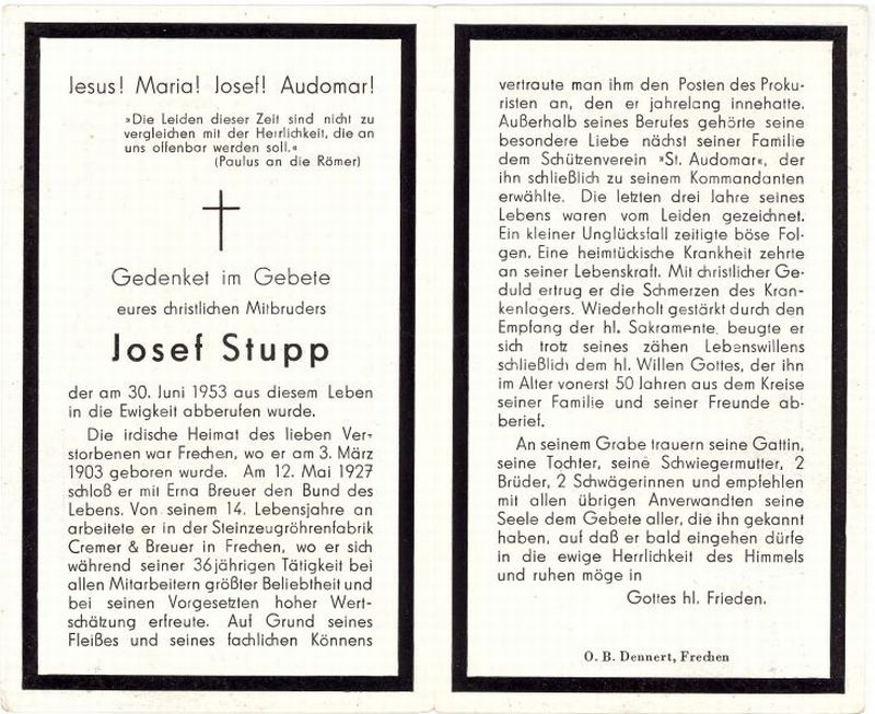 ∞ 12.05.1927 Erna Breuer; ab 14. Lebensjahr bei Fa. Cremer & Breuer in Frechen; Mitglied im Schützenverein Frechen; |