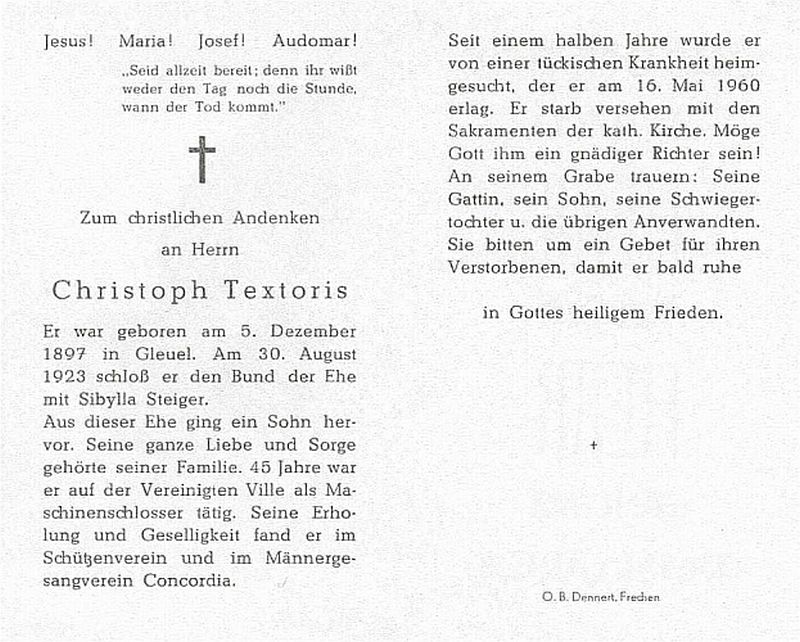 ∞ 30.08.1923 Sibylla Steiger; 45 Jahre Maschinenschlosser auf der Vereinigten Ville; |