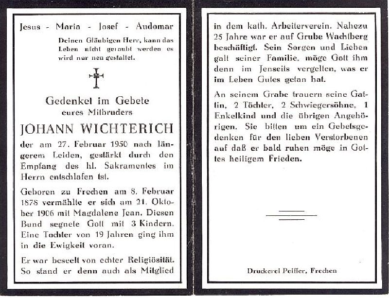 ∞ 14.1.1905 Katharina Valk aus Rhede; 5 K., davon 4 †; sein letzter Sohn im 2. Weltkrieg im Osten vermisst; Druck in Bocholt |