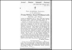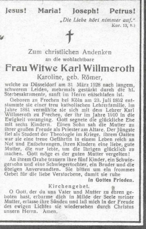 ∞ 1881 Karl Willmeroth aus Frechen, Lehrer; 1910 † ; 6 Kinder; ein Sohn Priester; |