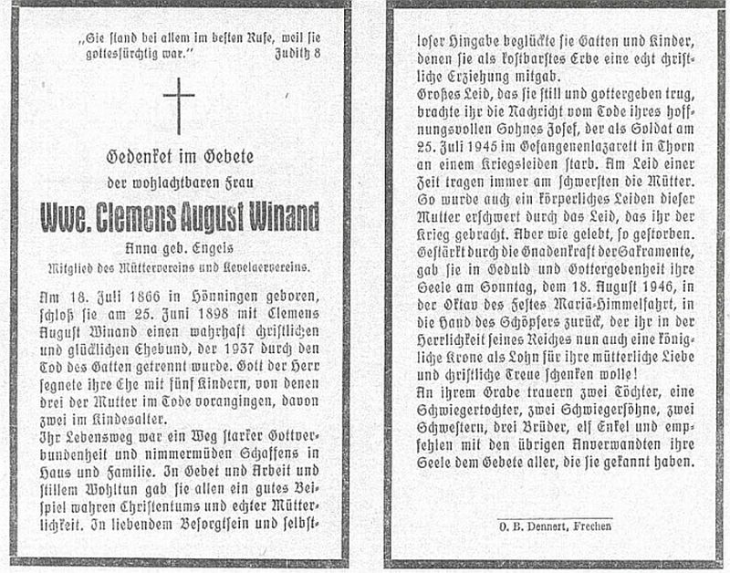 ∞ 25.06.1898 Clemens August Winand, 1937 † ; 5 Kinder; |