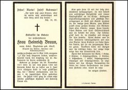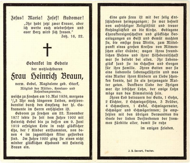 | ∞ 1. Ehe 1900 Heinrich Oebel, 09.06.1919 †; 7 Kinder, davon 4 †; 2. Ehe 1920 Heinrich Braun; |