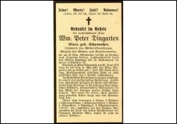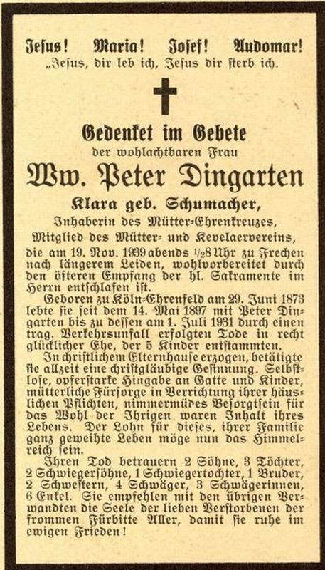 | ∞ 14.05.1897 mit Peter Dingarten, 01.07.1931 durch Verkehrsunfall †; 5 Kinder; Inhaberin des Mütter-Ehrenkreuzes; |