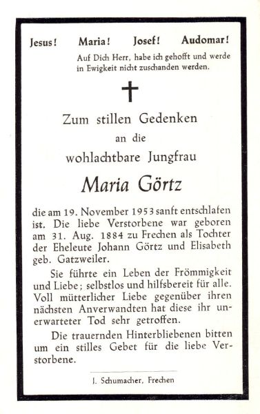 | wohlachtbare Jungfrau; Eltern Johann Görtz und Elisabeth geb. Gatzweiler; |